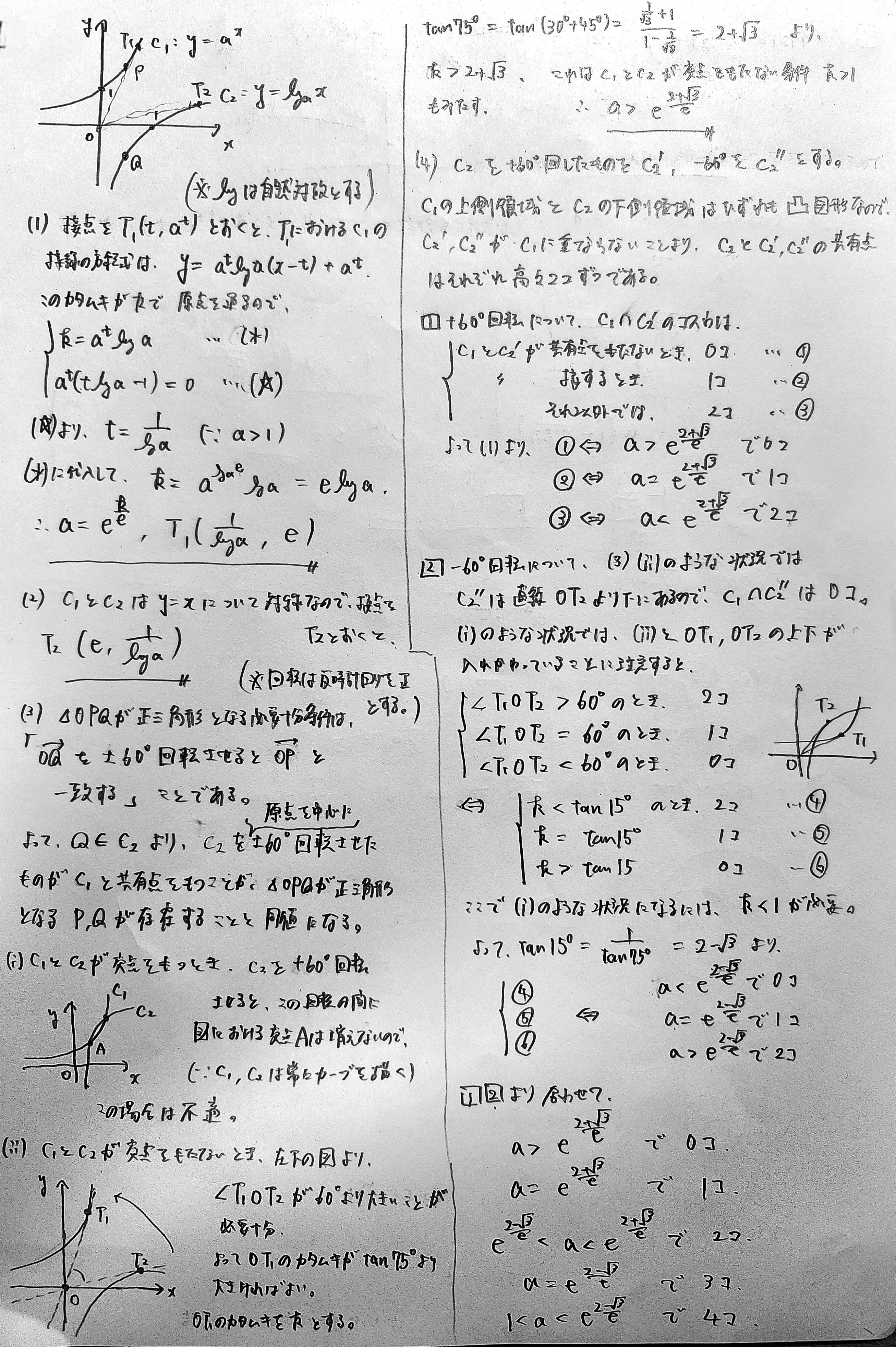 (1) $O$ を通る傾き $k$ の直線が $C_1$ に接するとき,$a$ の値を $k$ を用いて表せ。また,接点の座標を $a$ を用いて表せ。
