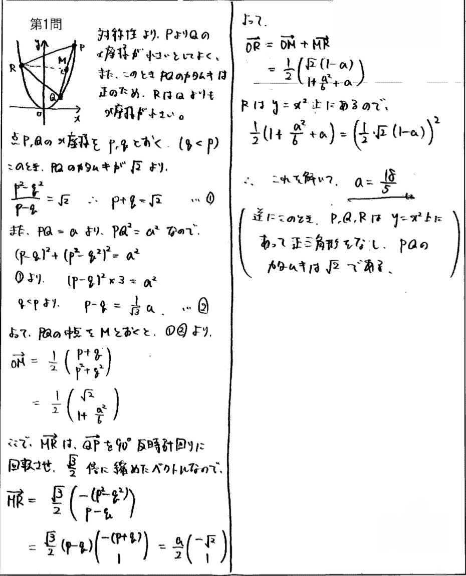 △PQR は一辺の長さ $a$ の正三角形であり、点 P, Q を通る直線の傾きは $\sqrt{2}$ である。