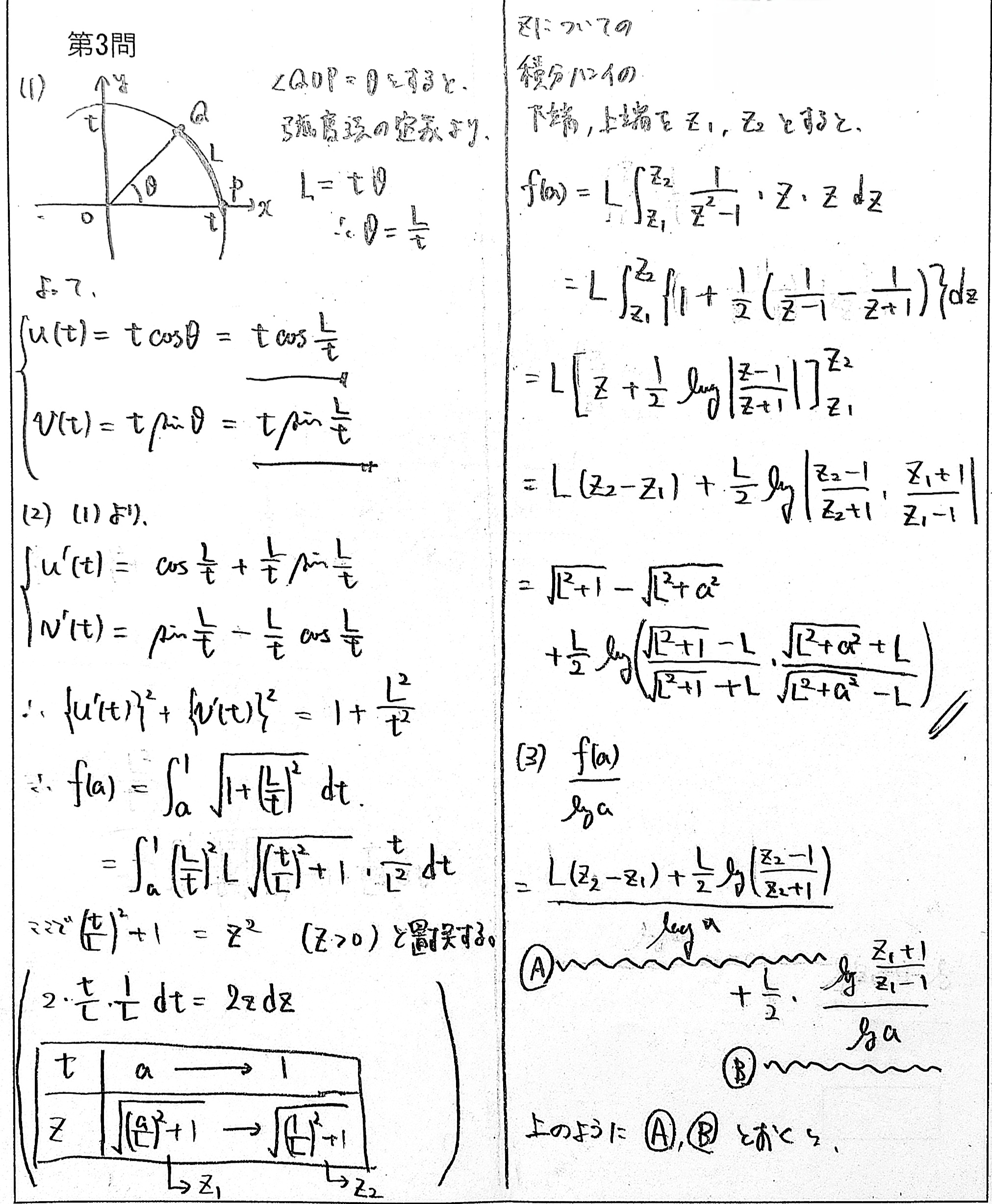 $L$ を正定数とする。座標平面の $x$ 軸上の正の部分にある点 $P(t,0)$ に対し,原点 $O$ を中心とし点 $P$ を通る円周上を,$P$ から出発して反時計回りに道のり $L$ だけ進んだ点を $Q(u(t),v(t))$ と表す。