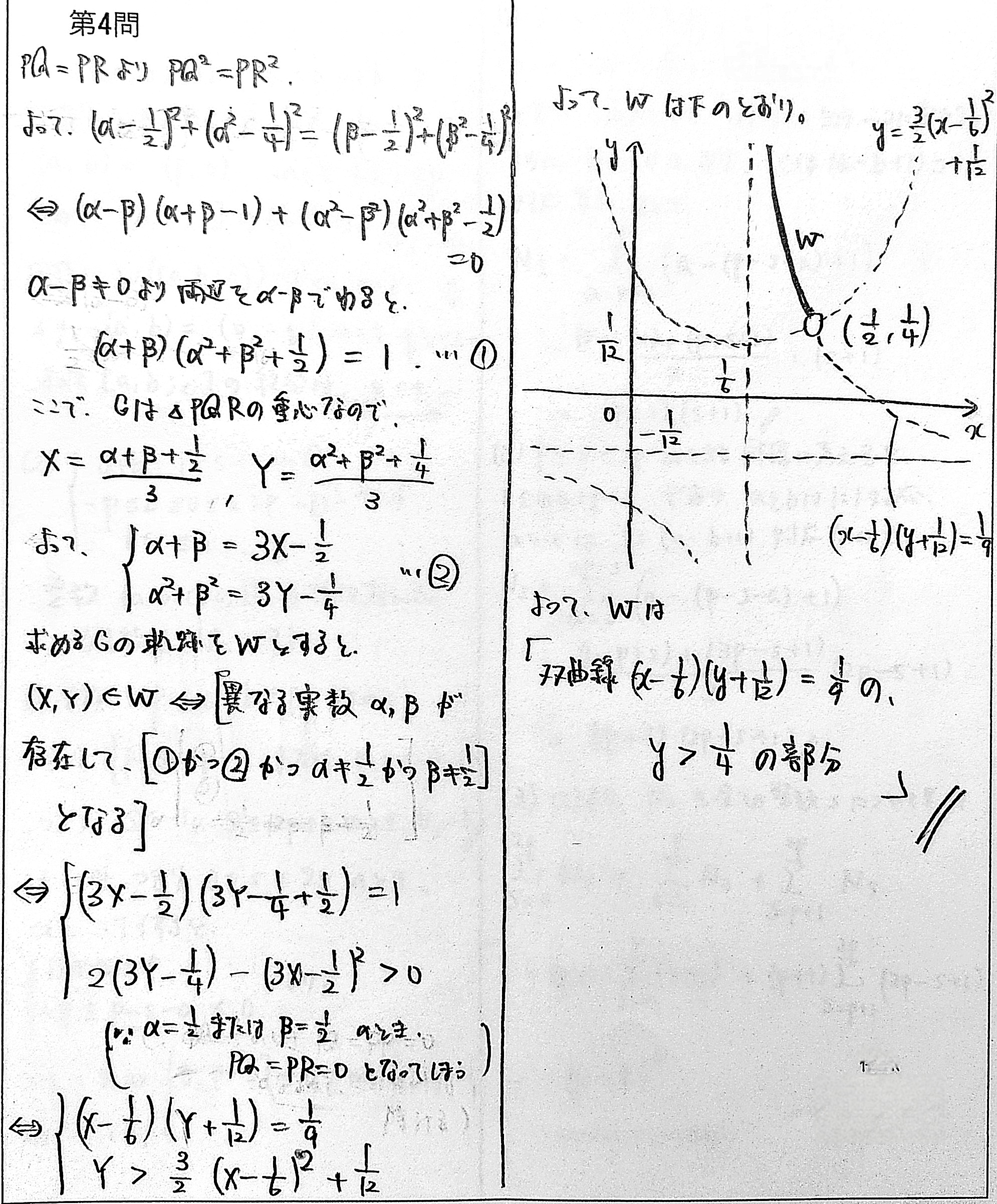 座標平面上の1点 $P\left(\frac12,\ \frac14\right)$ をとる。放物線 $y=x^2$ 上の2点 $Q(\alpha,\ \alpha^2)$,$R(\beta,\ \beta^2)$ を,3点 $P,\ Q,\ R$ が $QR$ を底辺とする二等辺三角形をなすように動かすとき,$\triangle PQR$ の重心 $G(X,\ Y)$ の軌跡を求めよ。