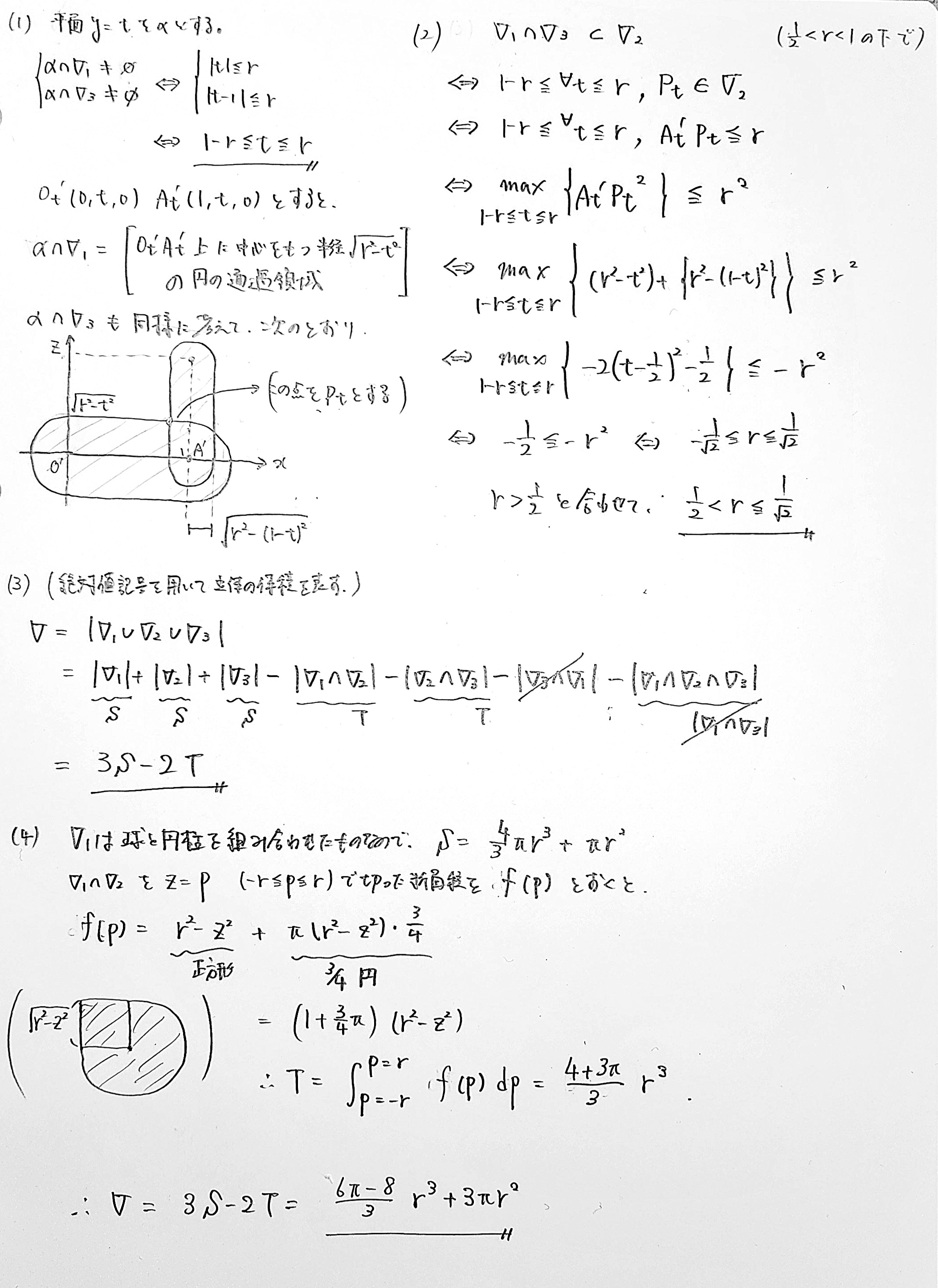 (3) $r$ は (2) の条件を満たすとする。$V_1$ の体積を $S$ とし,$V_1$ と $V_2$ の共通部分の体積を $T$ とする。$V_1,V_2,V_3$ を合わせて得られる立体 $V$ の体積を $S$ と $T$ を用いて表せ。
